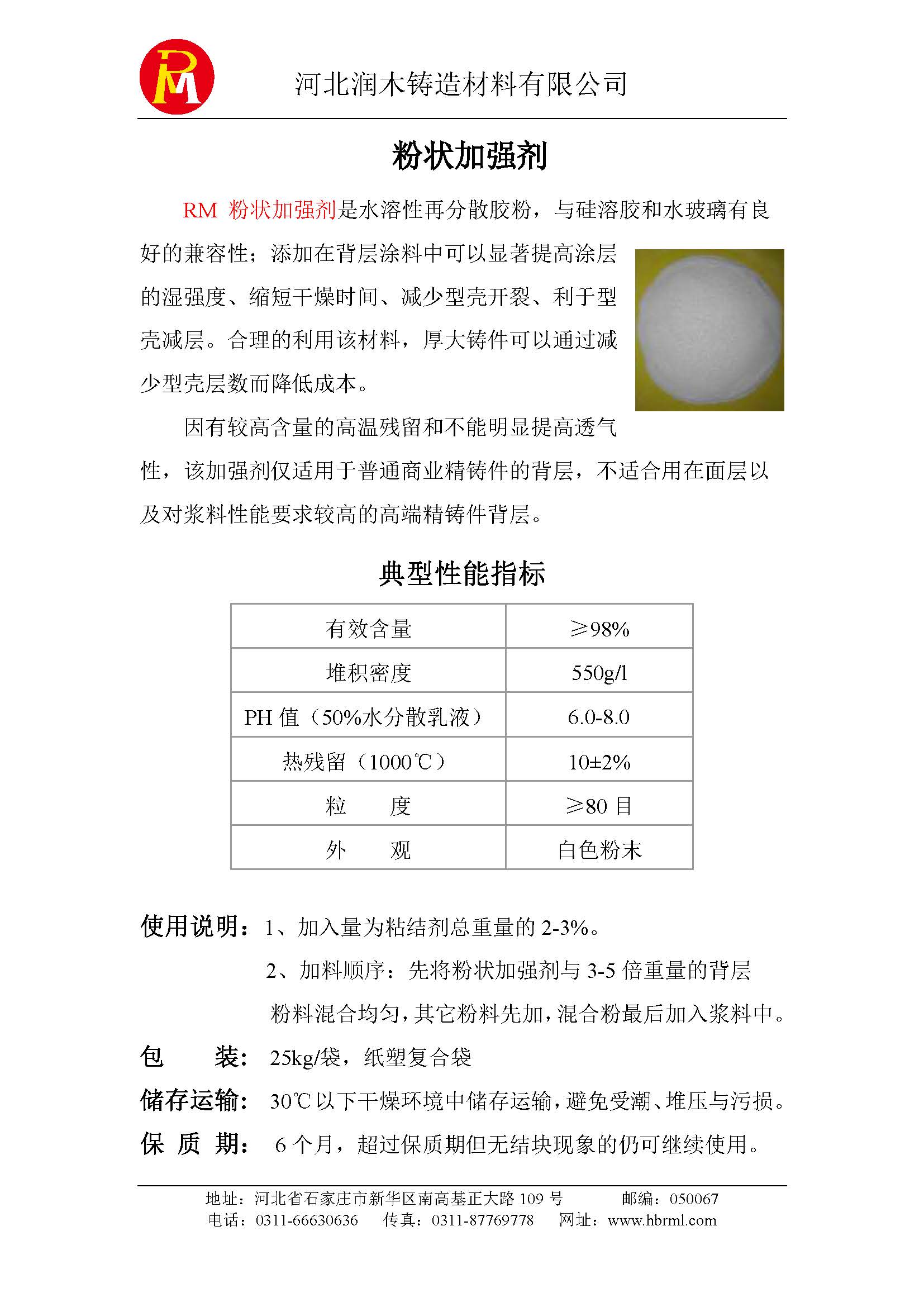 RM 粉狀加強(qiáng)劑是水溶性再分散膠粉,與硅溶膠和水玻璃有良好的兼容性;添加在背層涂料中可以顯著提高涂層的濕強(qiáng)度、縮短干燥時(shí)間、減少型殼開裂、利于型殼減層。合理的利用該材料,厚大鑄件可以通過減少型殼層數(shù)而降低成本。