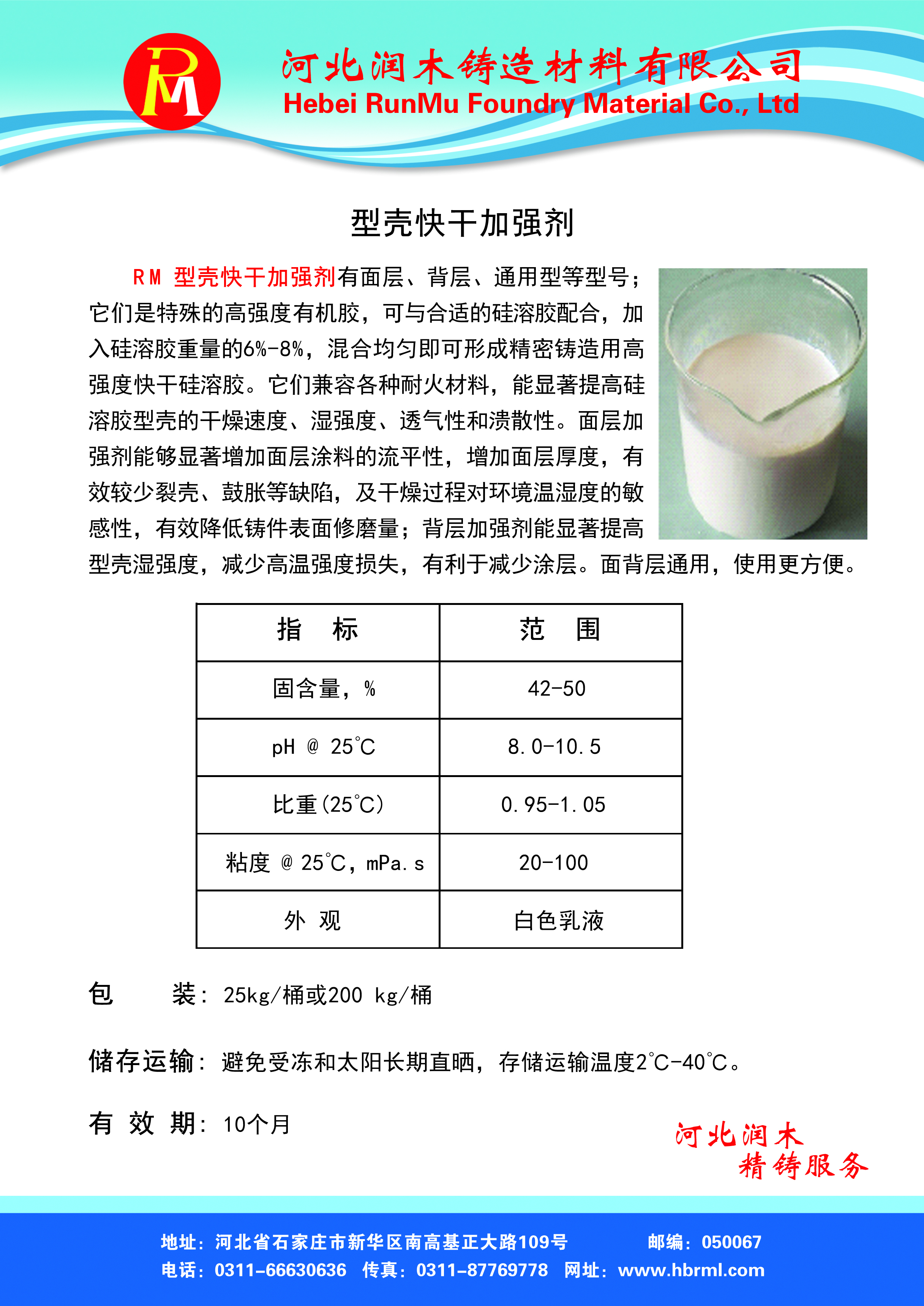RM通用型快干加強(qiáng)劑是面背層通用型高強(qiáng)度加強(qiáng)劑;它本身是特殊的高強(qiáng)度有機(jī)膠,可與合適的硅溶膠配合,加入硅溶膠重量的8%,混合均勻即可形成精密鑄造用高強(qiáng)度快干硅溶膠。它兼容各種耐火材料,能顯著提高硅溶膠型殼的干燥速度、濕強(qiáng)度、透氣性和潰散性。用于面層漿料能夠有效減少裂殼、鼓脹等缺陷,及干燥過(guò)程對(duì)環(huán)境溫濕度的敏感性,有效降低鑄件表面修磨量;面背層通用,使用更方便。