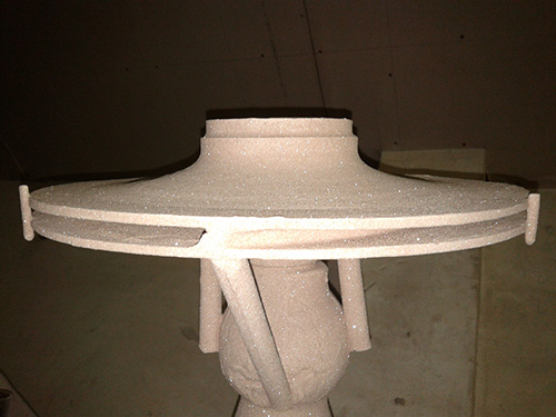 3、封腔:用100-200目鋯砂將各個(gè)內(nèi)腔灌滿、震實(shí),外口處用硅溶膠莫來(lái)泥封實(shí)。灌注鋯砂增加了整個(gè)內(nèi)腔型殼(相當(dāng)于型芯)的重量,防止?jié)茶T時(shí)金屬液在大平面上浮力過大引起的漂芯